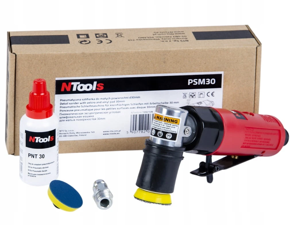 NTools PSM30 to pneumatyczna miniszlifierka oscylacyjna, doskonale nadaje się do usuwania wtrąceń, zanieczyszczeń z powierzchni lakieru i pracy z drobnymi rysami. Znakomita do dokładnego oczyszczania krawędzi i brzegów, oraz do pracy w trudno dostępnych miejscach.