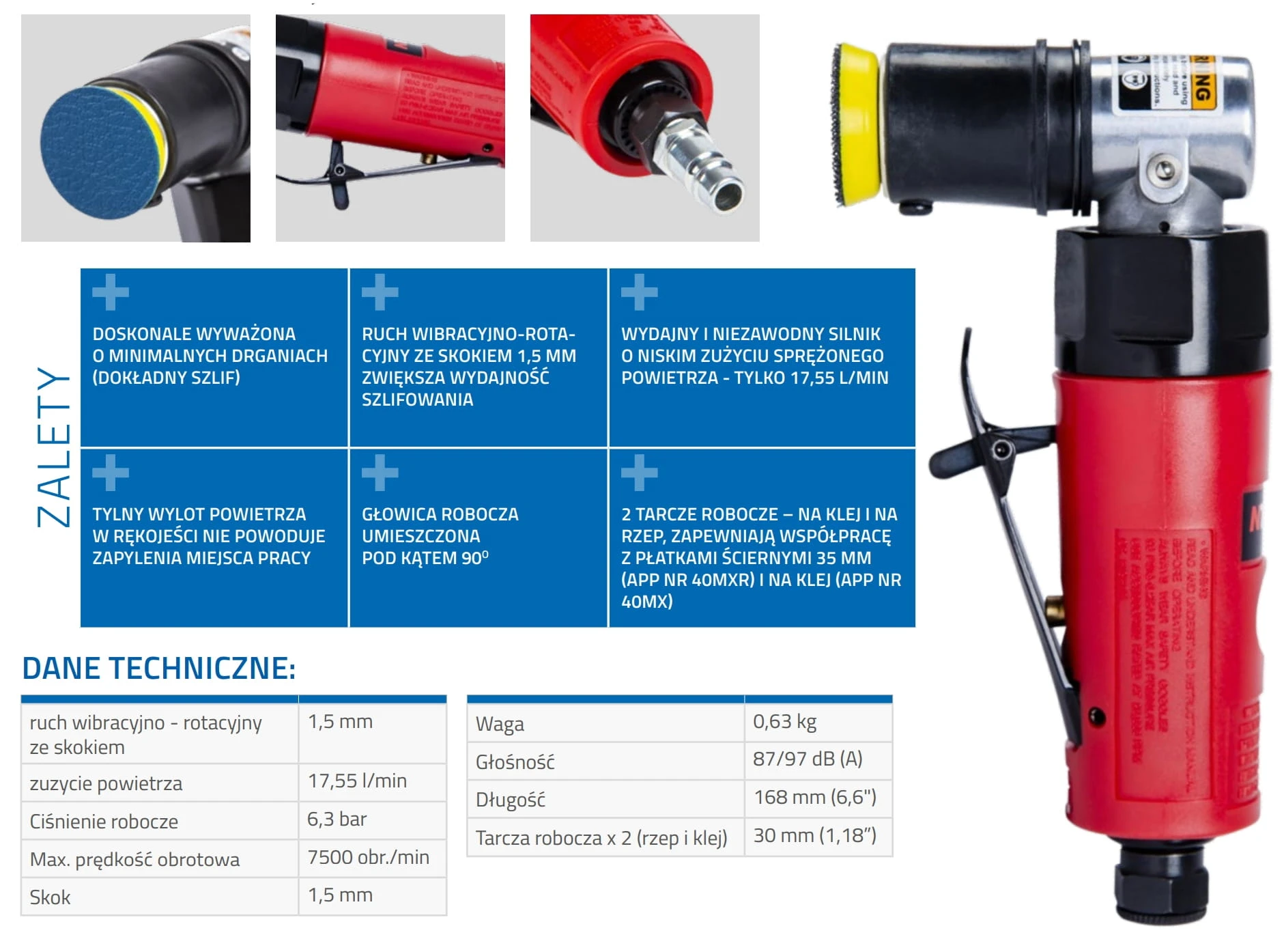 - ruch wibracyjno-rotacyjny ze skokiem 1,5mm zwiększa wydajność szlifowania