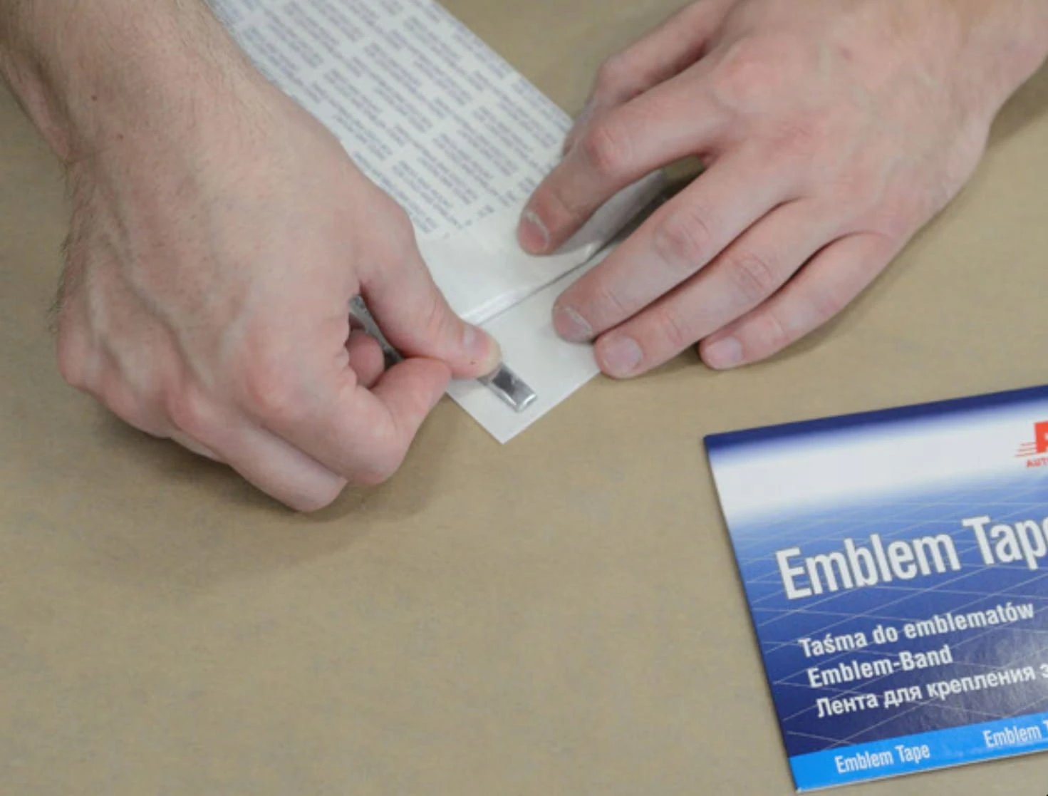 - Mocno przycisnąć emblemat, równomiernie na całej długości.