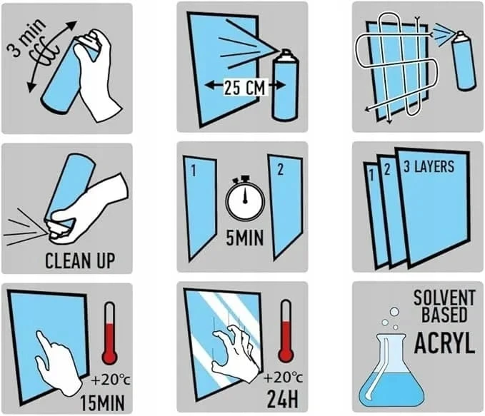 - Aby poprawić przyczepność farby, rozpyl cienką warstwę. Pozostawić do wyschnięcia na 3–5 minut. pomiędzy warstwami.